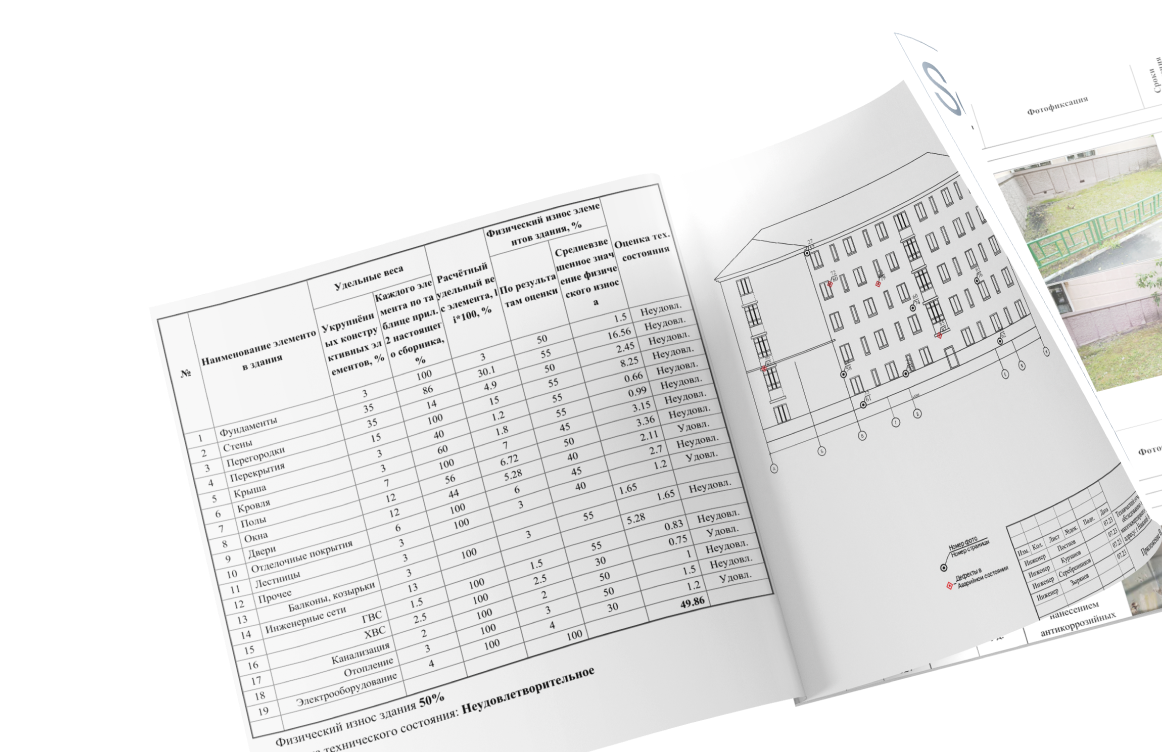 Для каждого объекта мы подготавливаем детальный технический отчёт, который включает в себя полное описание технического состояния здания, выявленные дефекты и неисправности.
